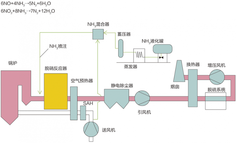 選擇性催化還原法(Selective Catalytic Reduction,簡稱SCR),在一定的反應溫度條件下,煙氣中的NOx和還原劑NH3在催化劑作用下發生還原反應,生成產物為N2和H2O。